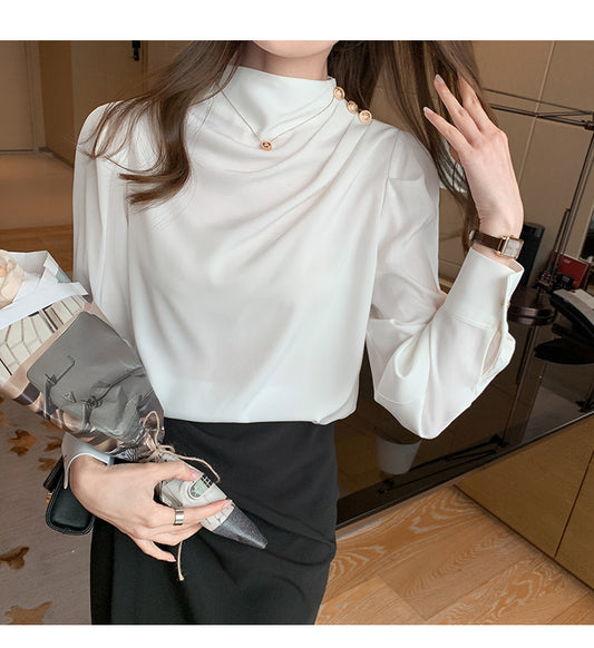 Elegant Buttoned Draped Long Sleeve Blouse – Available in Blue & White | Mode Amore